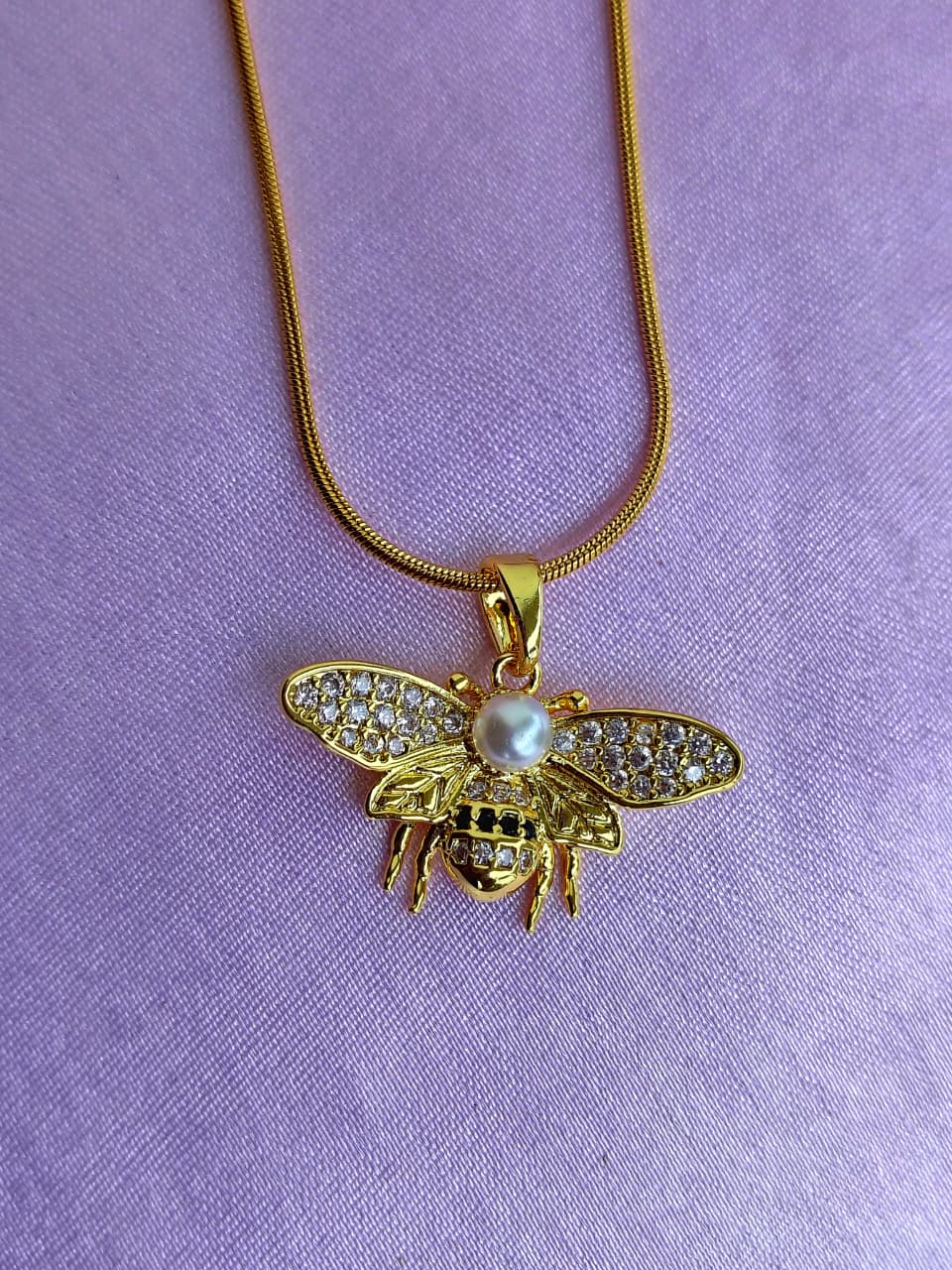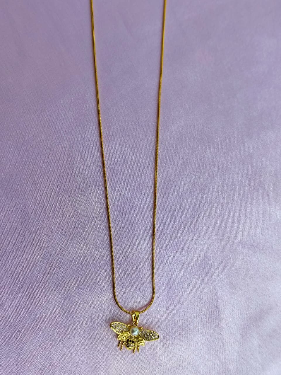 Queen Honey Bee Golden Pendant Chain with white pearl and Stones on its feathers, a beautiful carving of Queen Bee
